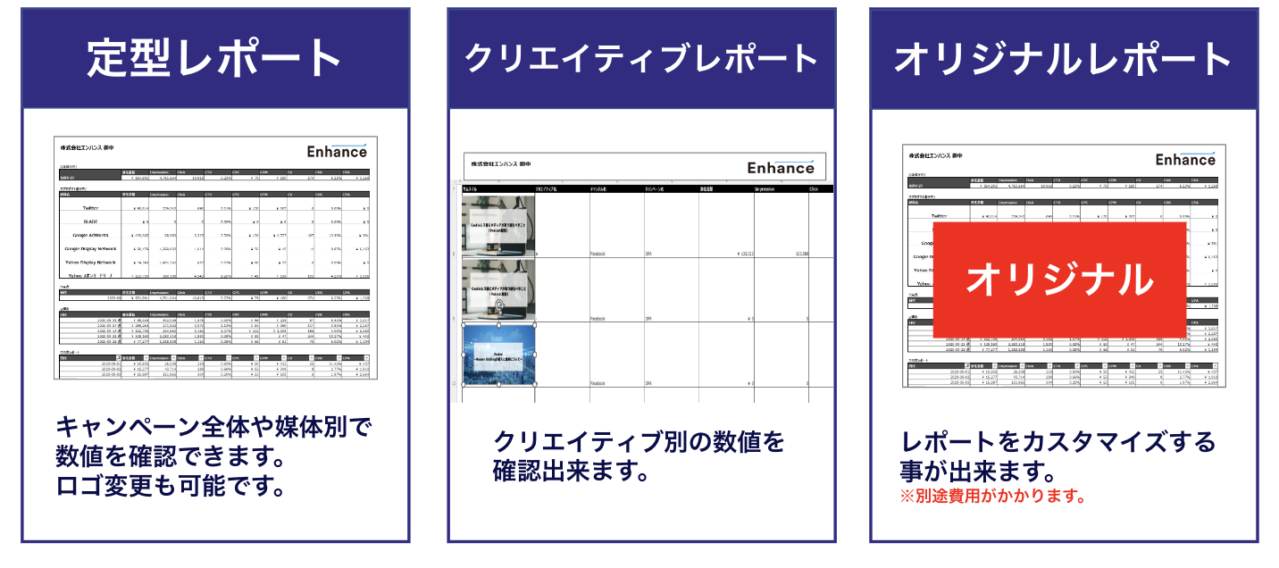 キャンペーン×デイリー、媒体別、アドグループ別、クリエイティブ別、顧客提出時に出力するだけで、完成形を出力する事ができます。