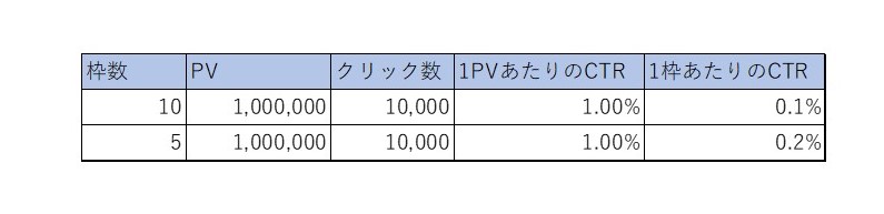 仮に月間100万PVのメディアにおいて、広告枠数がページにつき10枠と5枠あり、広告へのクリック数が同じ10,000クリックだったと仮定します。枠の設置位置などによりそれぞれの広告枠のCTRは異なりますが、1枠あたりのCTRを平均した際には2倍の差が出ています。広告主は配信実績や費用対効果を元に入札単価を設定しているケースが多く、その指標として枠のCTRは重要な指標となっています。